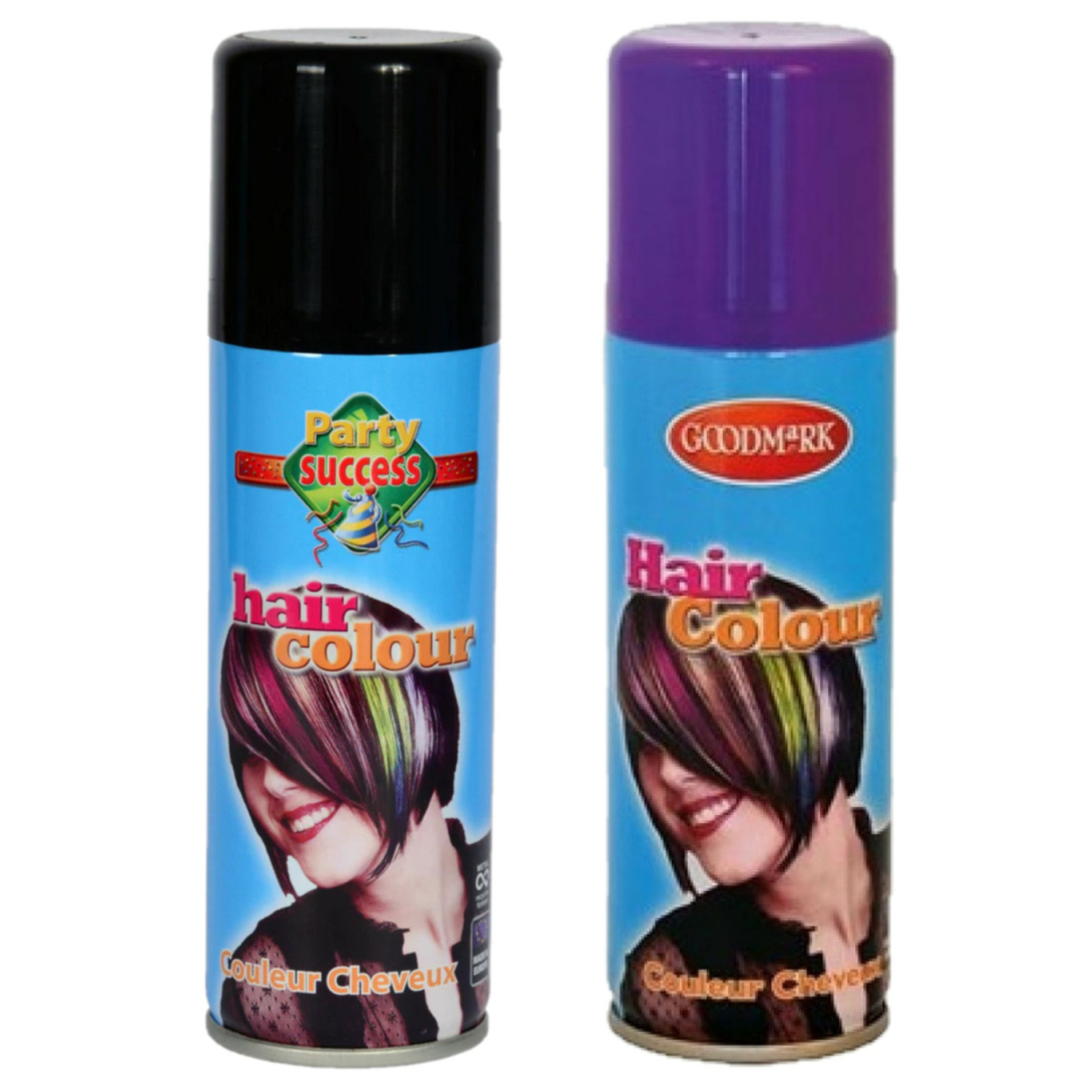 Carnaval verkleed haar verf/spray zwart/paars 125 ml. Kleur makkelijk je haar. Deze spray is makkelijk uitwasbaar met water. Kleur je haar met deze verkleedkleding accessoires sets. Haar verven voor kinderen en volwassenen. , Dit artikel bestaat uit:, 1x Carnaval verkleed haarverf/spray – paars – 125 ml – kinderen en volwassenen – makkelijk uitwassen, 1x Carnaval verkleed haarverf/spray – zwart – 125 ml – kinderen en volwassenen – makkelijk uitwassen