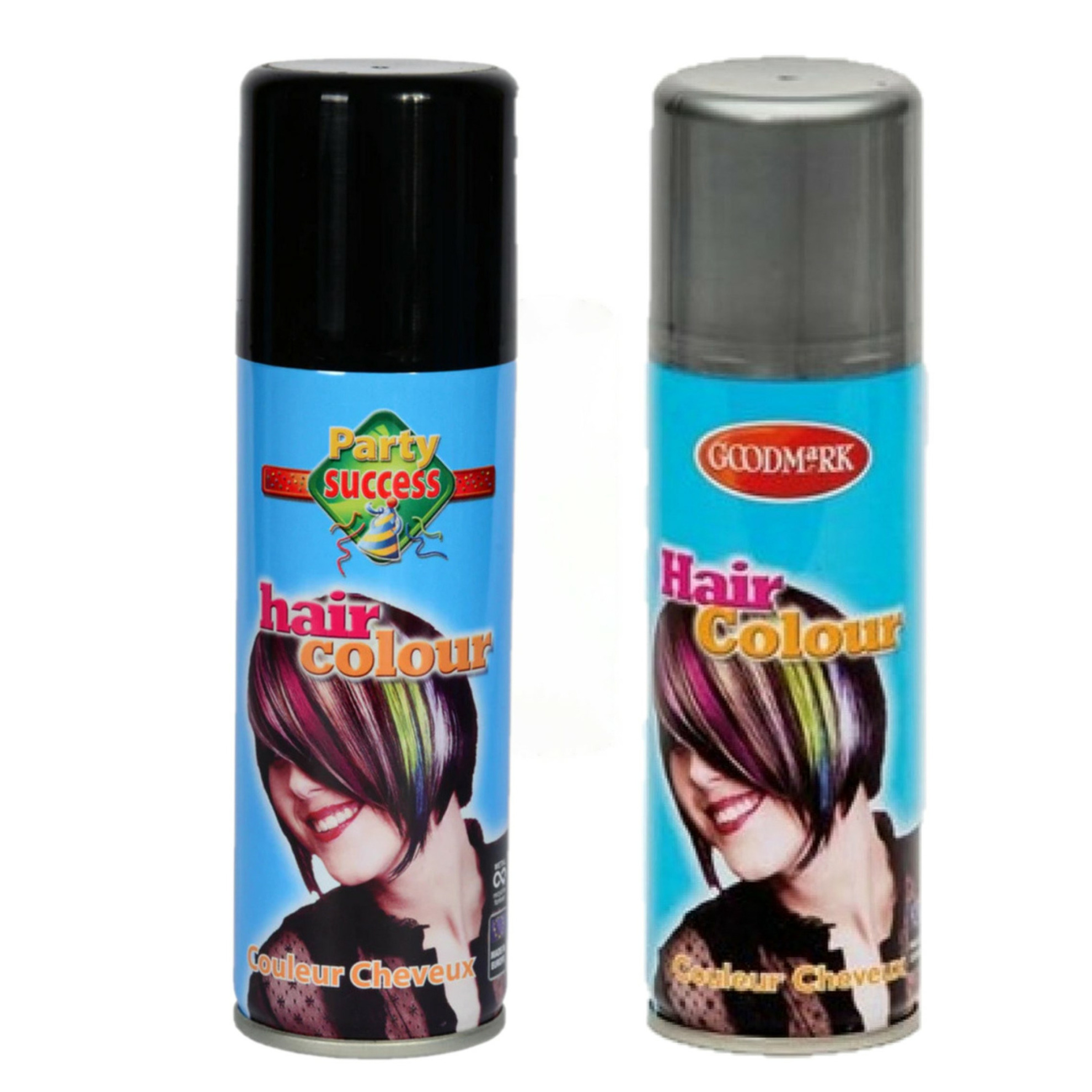 Carnaval verkleed haar verf/spray zwart/zilver 125 ml. Kleur makkelijk je haar. Deze spray is makkelijk uitwasbaar met water. Kleur je haar met deze verkleedkleding accessoires sets. Haar verven voor kinderen en volwassenen. , Dit artikel bestaat uit:, 1x Carnaval verkleed haarverf/spray – zilver – 125 ml – kinderen en volwassenen – makkelijk uitwassen, 1x Carnaval verkleed haarverf/spray – zwart – 125 ml – kinderen en volwassenen – makkelijk uitwassen