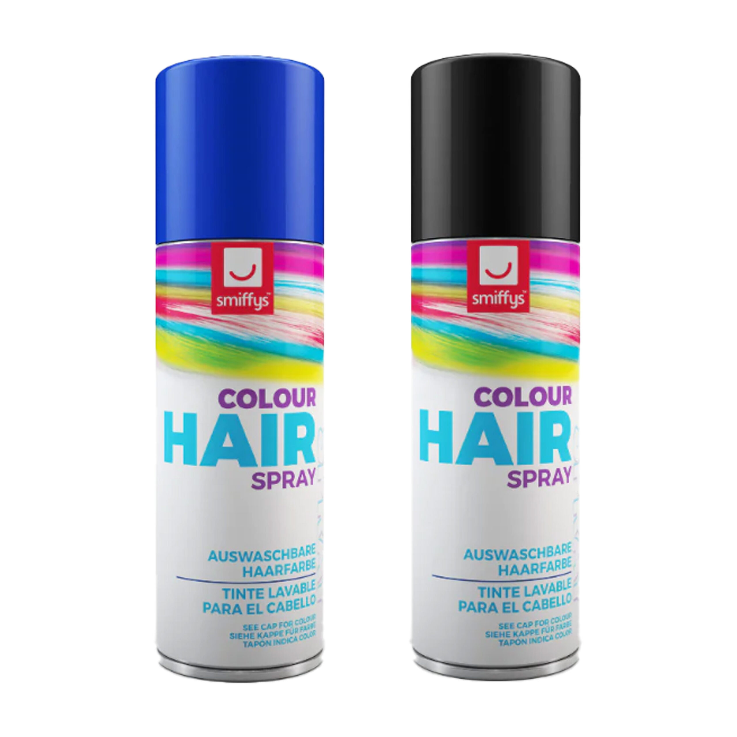 Carnaval verkleed hoofdhaar verf/spray in de kleuren zwart en blauw in busjes van 125 ml. Set van 2x stuks dus. Kleur makkelijk je haar. Deze spray is makkelijk uitwasbaar met water. Verkleed accessoires voor kinderen en volwassenen. , Dit artikel bestaat uit:, 1x Carnaval haarverf – blauw – spuitbus – 125 ml – haarspray, 1x Carnaval haarverf – zwart – spuitbus – 125 ml – haarspray