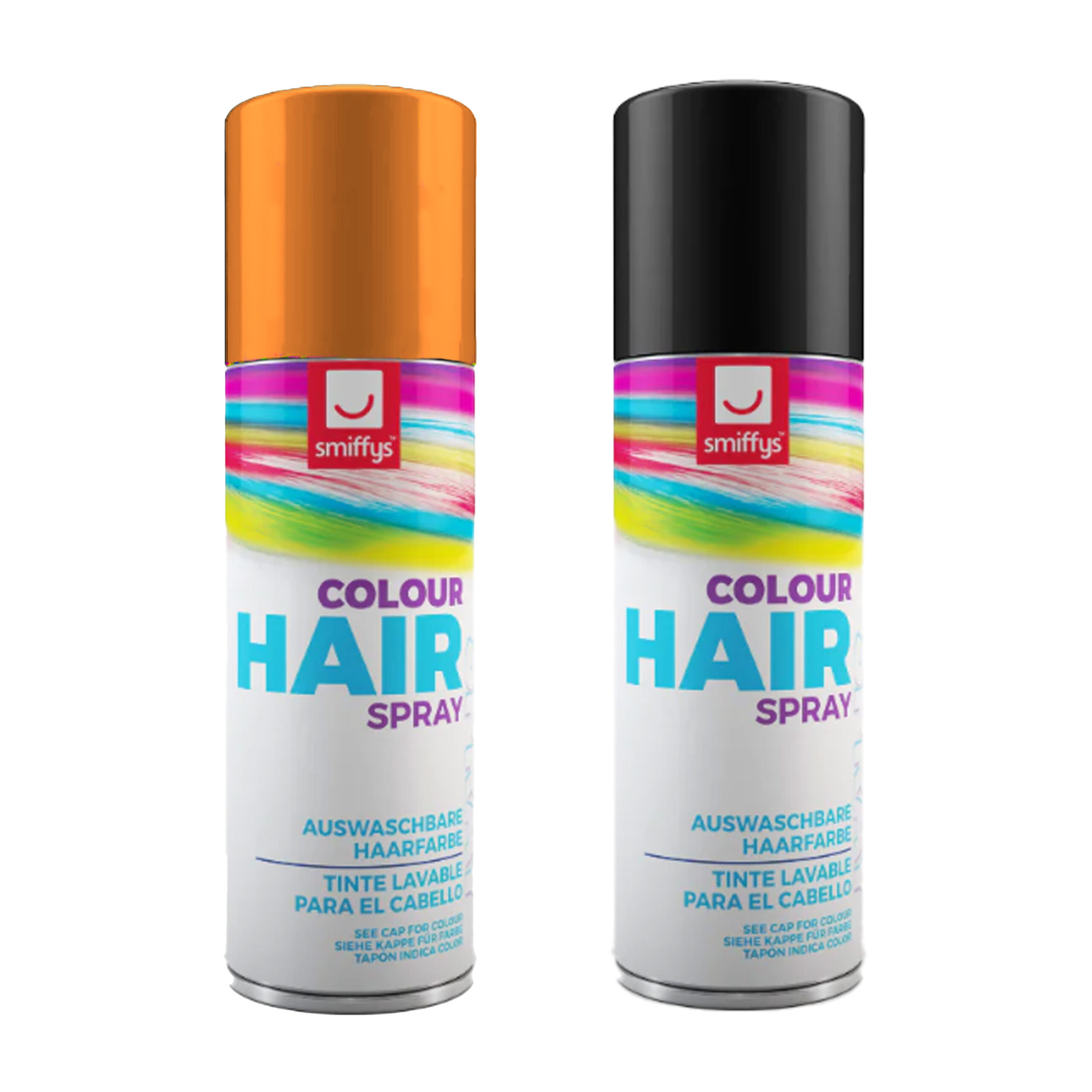 Carnaval verkleed hoofdhaar verf/spray in de kleuren zwart en oranje in busjes van 125 ml. Set van 2x stuks dus. Kleur makkelijk je haar. Deze spray is makkelijk uitwasbaar met water. Verkleed accessoires voor kinderen en volwassenen. , Dit artikel bestaat uit:, 1x Carnaval haarverf – zwart – spuitbus – 125 ml – haarspray, 1x Carnaval haarverf – oranje – spuitbus – 125 ml – haarspray