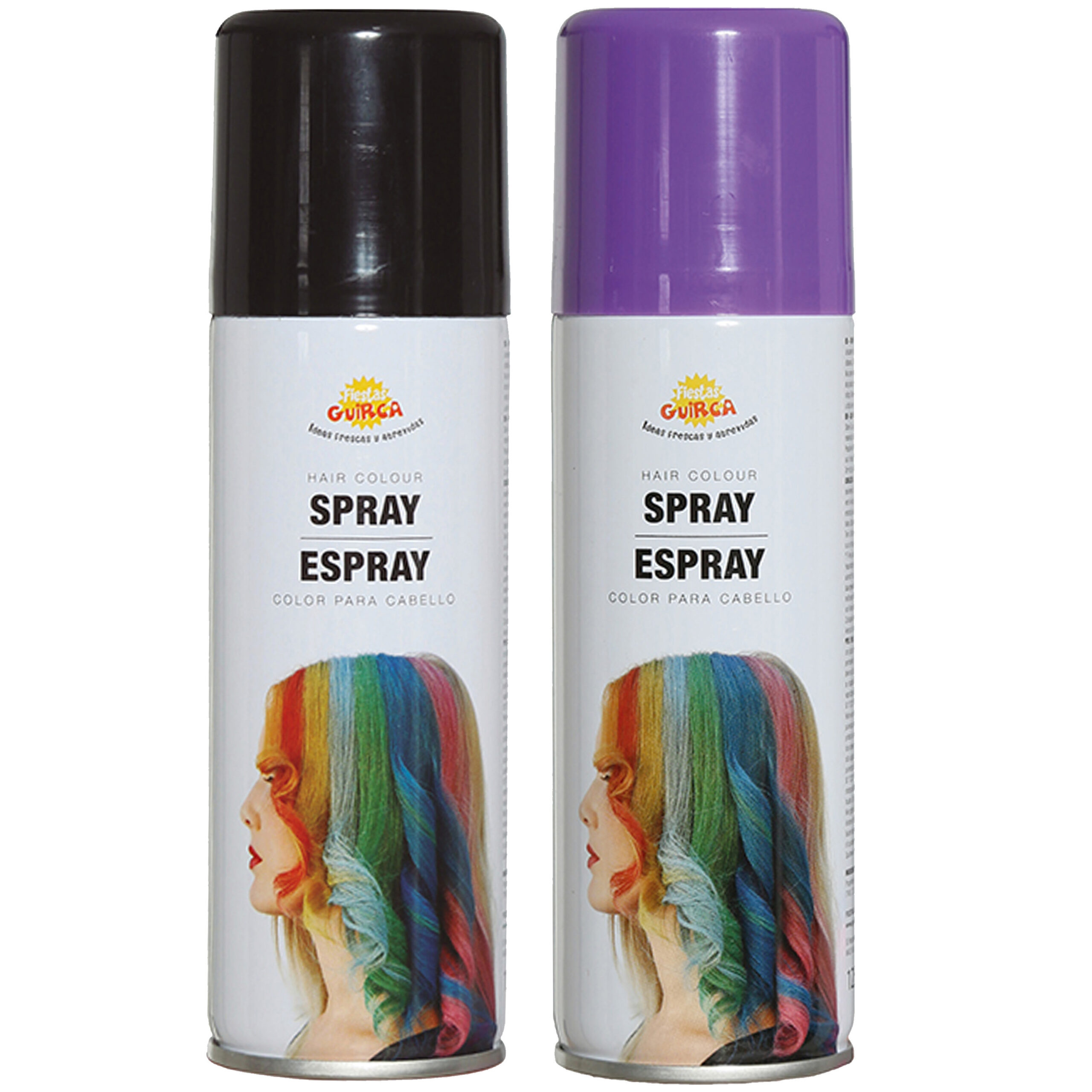 Carnaval verkleed haar verf/spray in de kleuren zwart en paars 125 ml. Kleur makkelijk je haar. Deze spray is makkelijk uitwasbaar met water. Verkleed accessoires voor kinderen en volwassenen. , Dit artikel bestaat uit:, 1x Carnaval verkleed haar verf/spray – paars – spuitbus – 125 ml, 1x Carnaval verkleed haar verf/spray – zwart – spuitbus – 125 ml