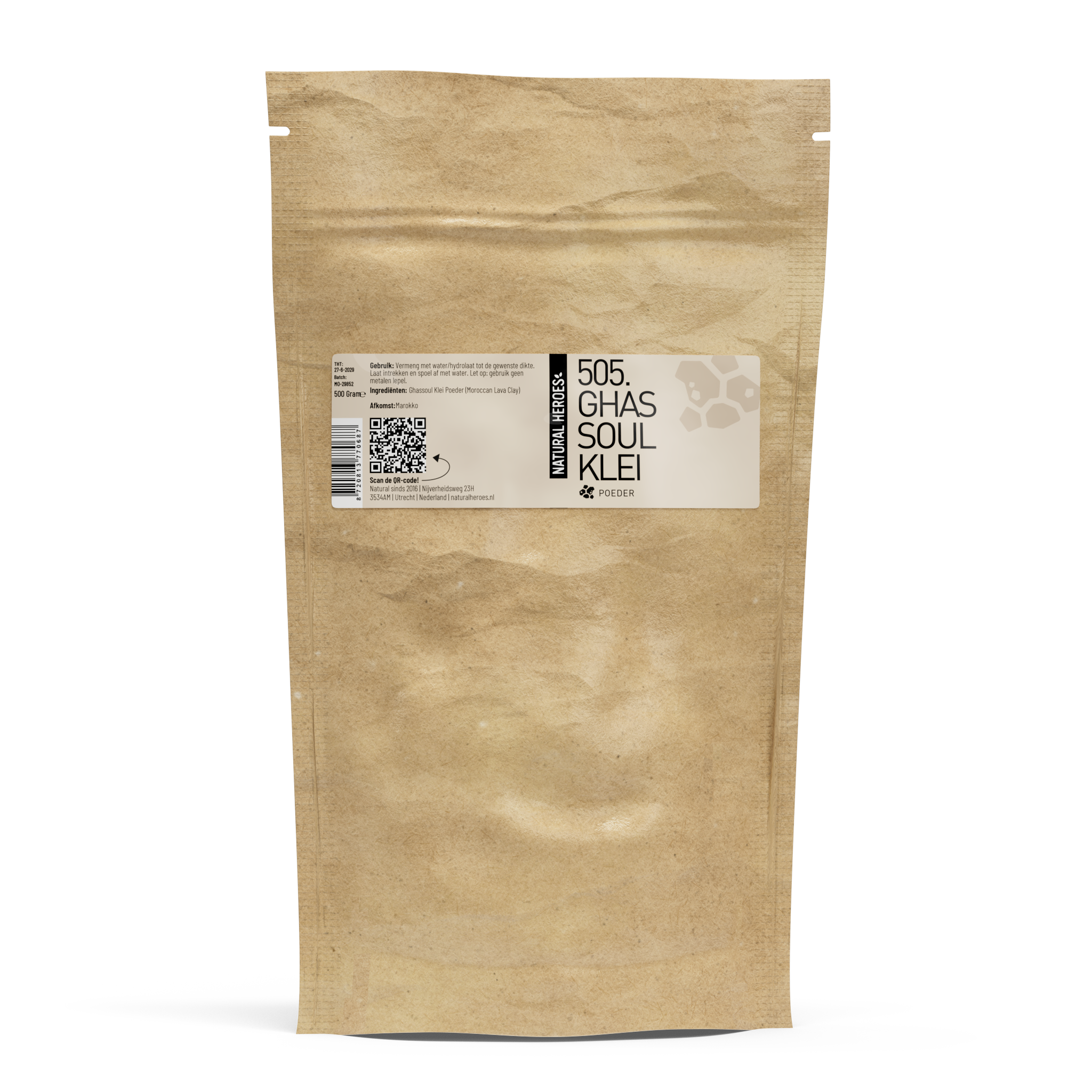 Ghassoul klei is rijk aan de mineralen silica, magnesium, kalium en ijzer die afvalstoffen uit de huid absorberen. De klei reinigt je huid op milde wijze, verfijnt je poriën en op den duur zul je verbetering van de huidstructuur zien en een heldere, stralende huid hebben met minder droogheid.