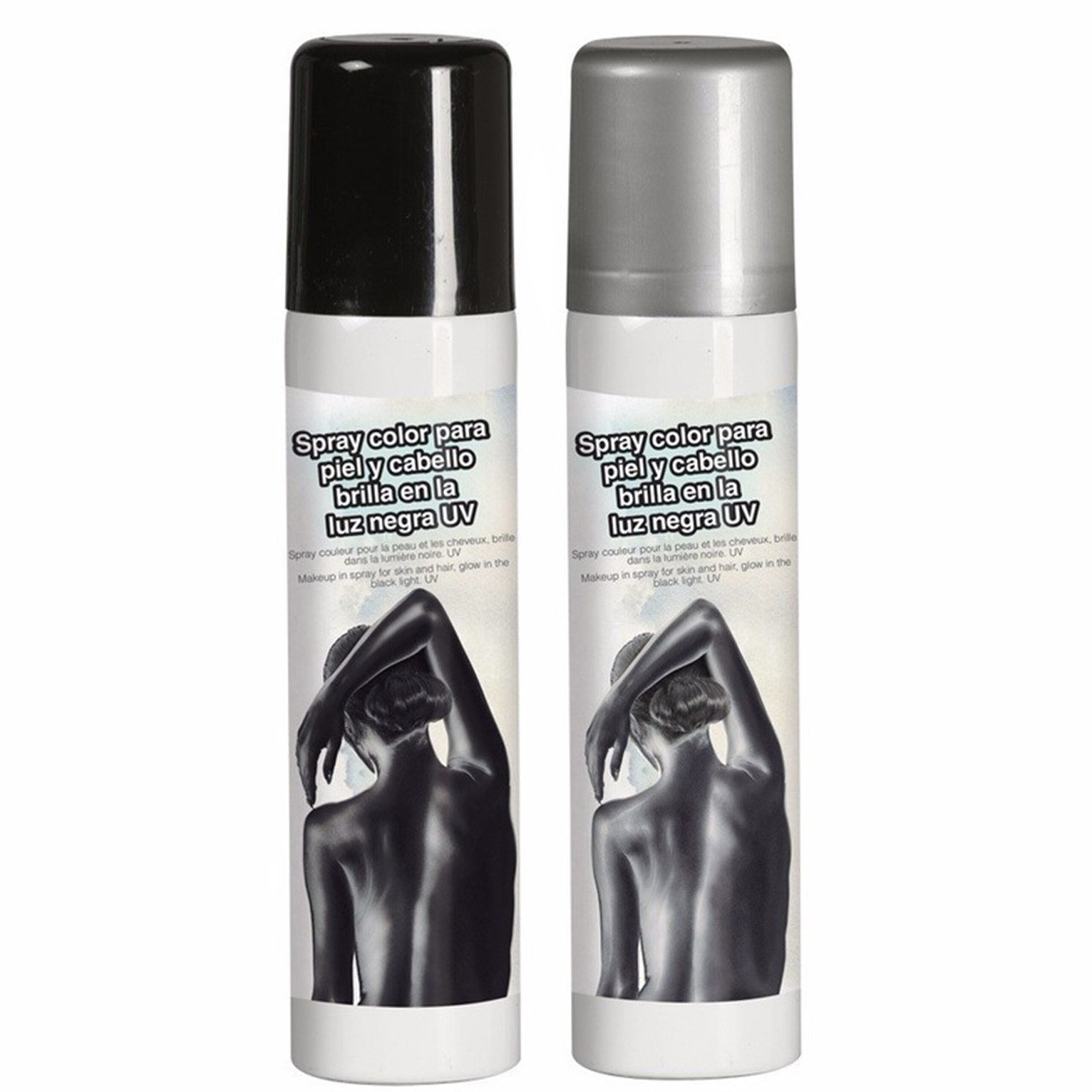 Guirca haarspray/bodypaint spray set van 2x kleuren, zilver en zwart 75 ml. Gebruik deze haarverf voor bijvoorbeeld een themafeestje of tijdens carnaval. De spray is makkelijk uitwasbaar met water en shampoo. Hoe te gebruiken: Bewaren en gebruiken op kamertemperatuur. Goed schudden voor gebruik. Houd de spray rechtop, spray in korte pulsen op een afstand van 20 cm en vermijd gezicht en ogen. Bescherm uw kledij en andere synthetische materialen. Inhoud per spray: 75 ml. , Dit artikel bestaat uit:, 1x Bodypaint spray – Zilver – lichaam- en haarspray – Verf/schmink voor lichaam en haar, 1x Bodypaint spray – Zwart – lichaam- en haarspray – Verf/schmink voor lichaam en haar