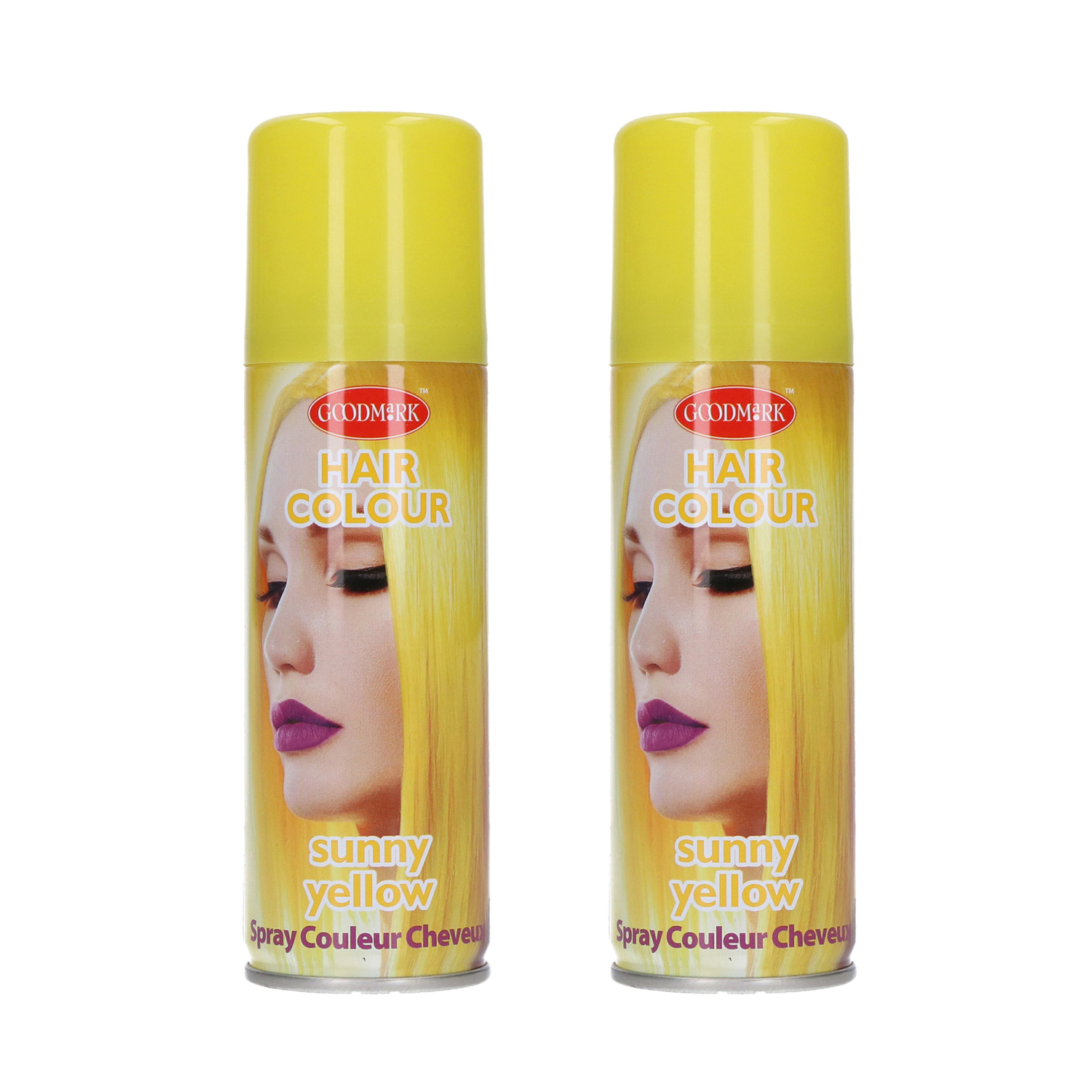 2x haarspray of haarverf busjes in de kleur geel. Deze haarspray is gemakkelijk uitwasbaar. De inhoud van deze haarspray bus is 125 ml. Maak uw verkleed outfit helemaal compleet met gekleurd haar. Geschikt voor volwassenen en kinderen. Verkleed accessoires.