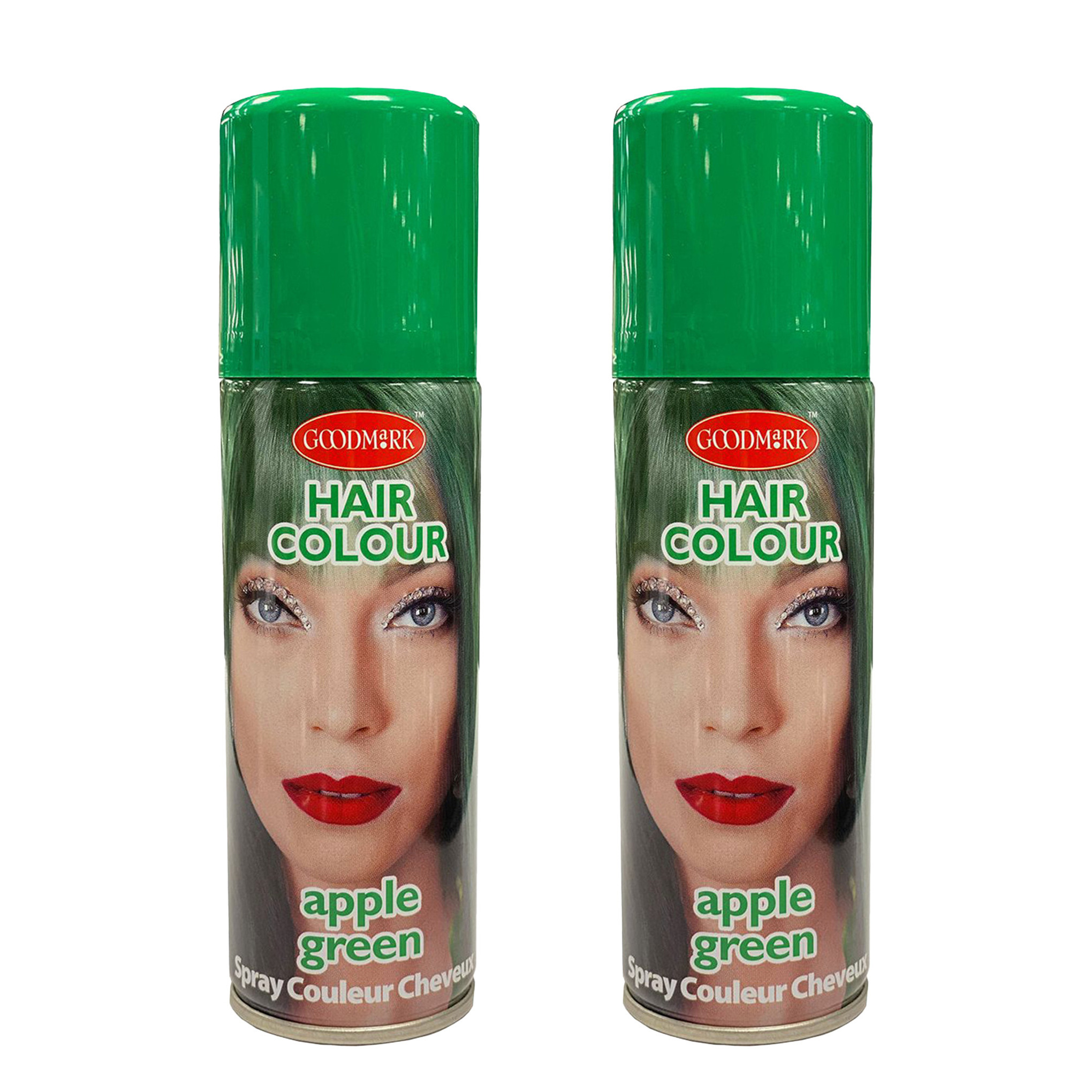 2x haarspray of haarverf busjes in de kleur groen. Deze haarspray is gemakkelijk uitwasbaar. De inhoud van deze haarspray bus is 125 ml. Maak uw verkleed outfit helemaal compleet met gekleurd haar. Geschikt voor volwassenen en kinderen. Verkleed accessoires.
