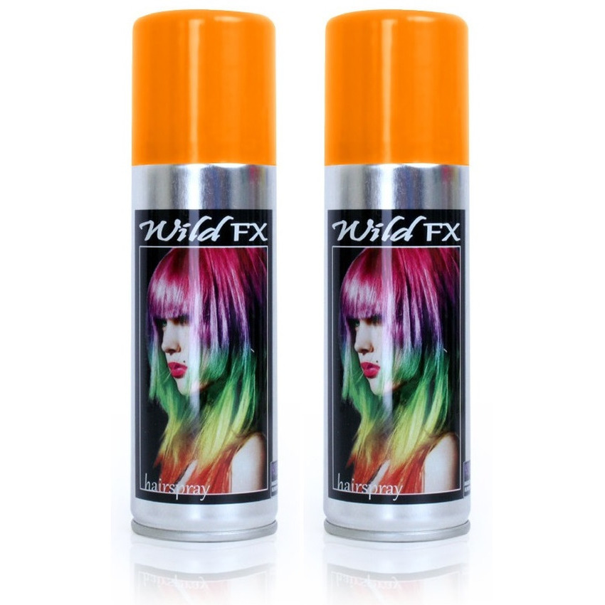 2x haarspray of haarverf busjes in de kleur oranje. Deze haarspray is gemakkelijk uitwasbaar. De inhoud van deze haarspray bus is 125 ml. Maak uw verkleed outfit helemaal compleet met gekleurd haar. Geschikt voor volwassenen en kinderen. Verkleed accessoires.