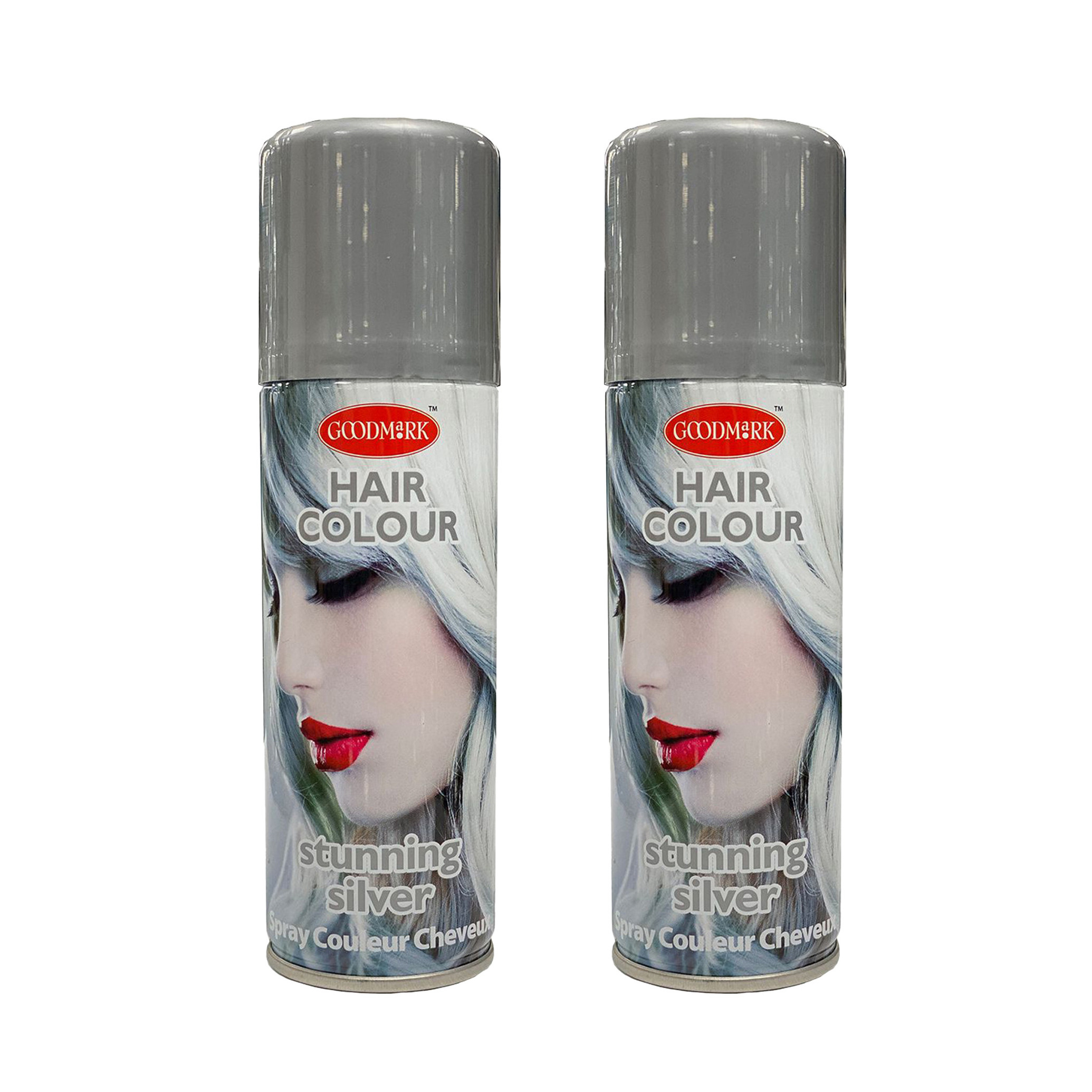2x haarspray of haarverf busjes in de kleur zilver. Deze haarspray is gemakkelijk uitwasbaar. De inhoud van deze haarspray bus is 125 ml. Maak uw verkleed outfit helemaal compleet met gekleurd haar. Geschikt voor volwassenen en kinderen. Verkleed accessoires.