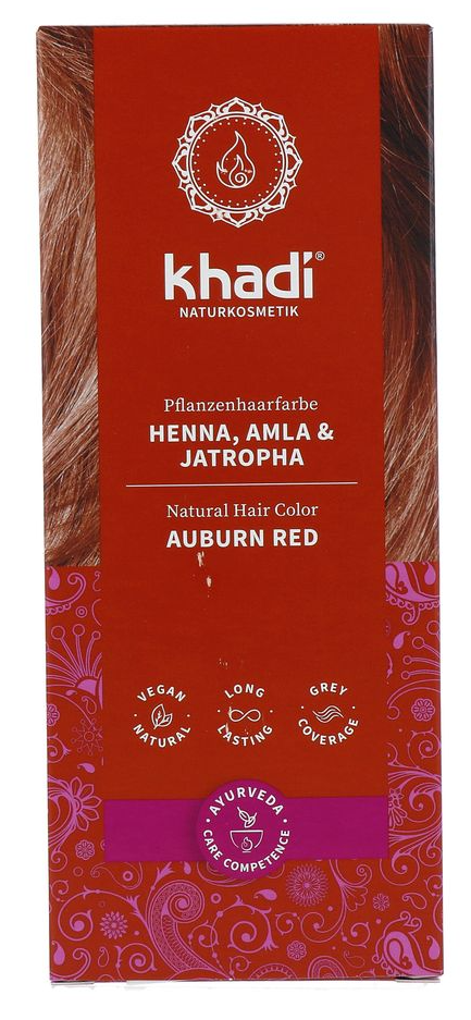 Khadi Haarverf Henna, Alma en Jatropha (100gr) is een 100% plantaardige en vegan haarverfpoeder waarmee u uw haar op een natuurlijke manier voorziet van de meeste intense en prachtige kleur. De kleur Henna, Alma en Jatropha geeft een bruinrode kleuring aan blond, bruin,