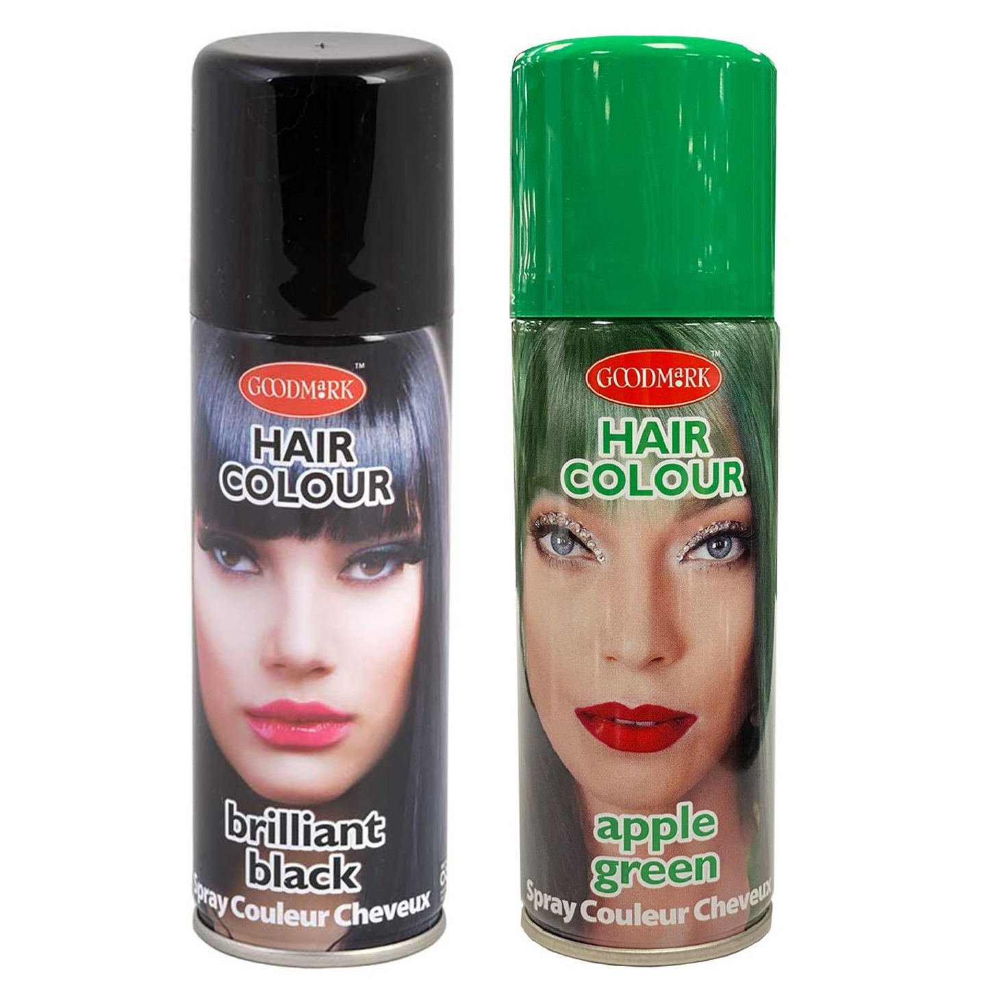 Set van 2x kleuren haarverf/haarspray van 125 ml. Zwart en Groen. Carnaval verkleed spullen. Makkelijk uitwasbaar met water. Haarverf combies kleuren set voor o.a. Halloween. , Dit artikel bestaat uit:, 1x Haarspray of haarverf – kleur groen – verkleed accessoires – 125 ml – volwassenen en kinderen, 1x Haarspray of haarverf – kleur zwart – verkleed accessoires – 125 ml – volwassenen en kinderen