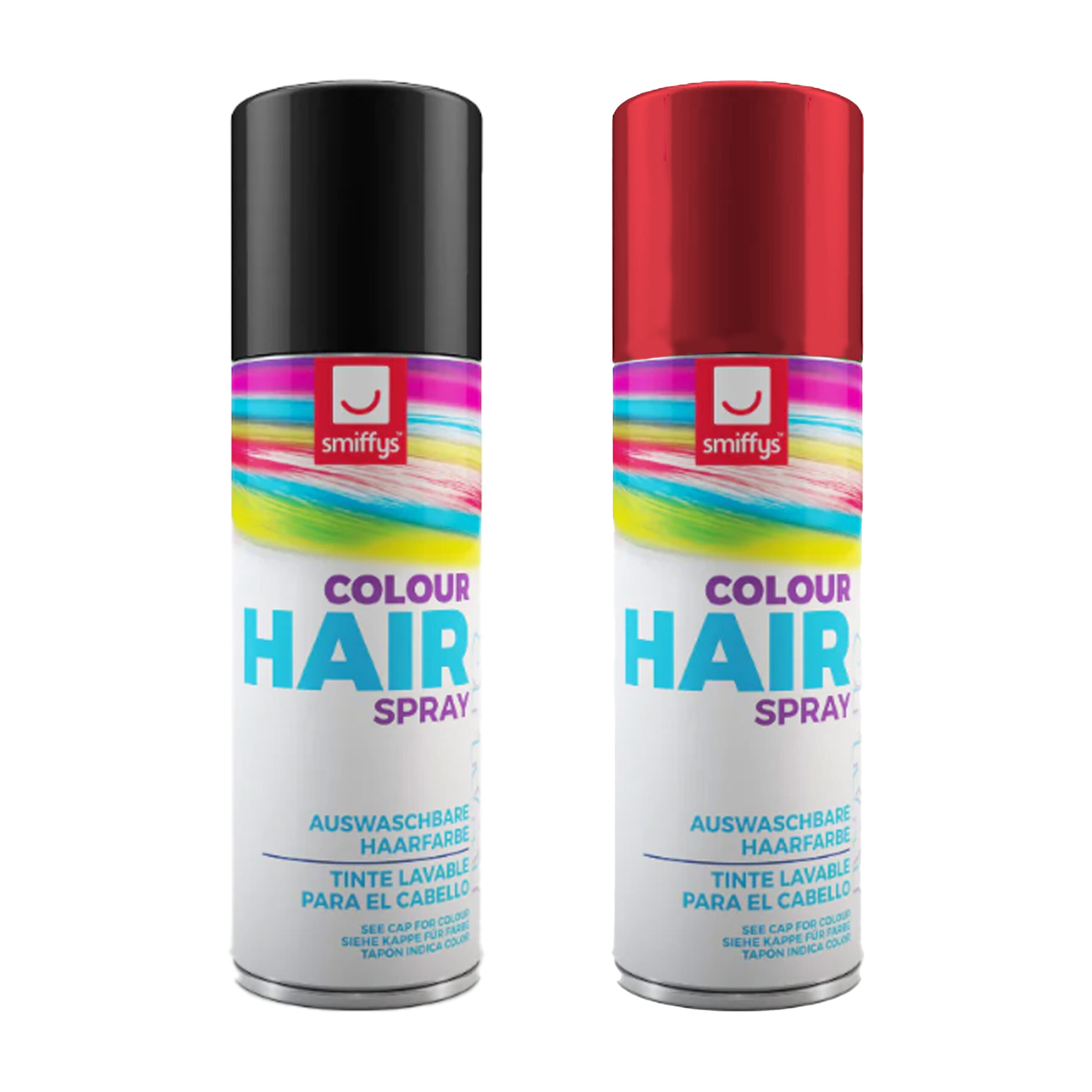 Carnaval verkleed hoofdhaar verf/spray in de kleuren zwart en rood in busjes van 125 ml. Set van 2x stuks dus. Kleur makkelijk je haar. Deze spray is makkelijk uitwasbaar met water. Verkleed accessoires voor kinderen en volwassenen. , Dit artikel bestaat uit:, 1x Carnaval haarverf – zwart – spuitbus – 125 ml – haarspray, 1x Carnaval haarverf – rood – spuitbus – 125 ml – haarspray